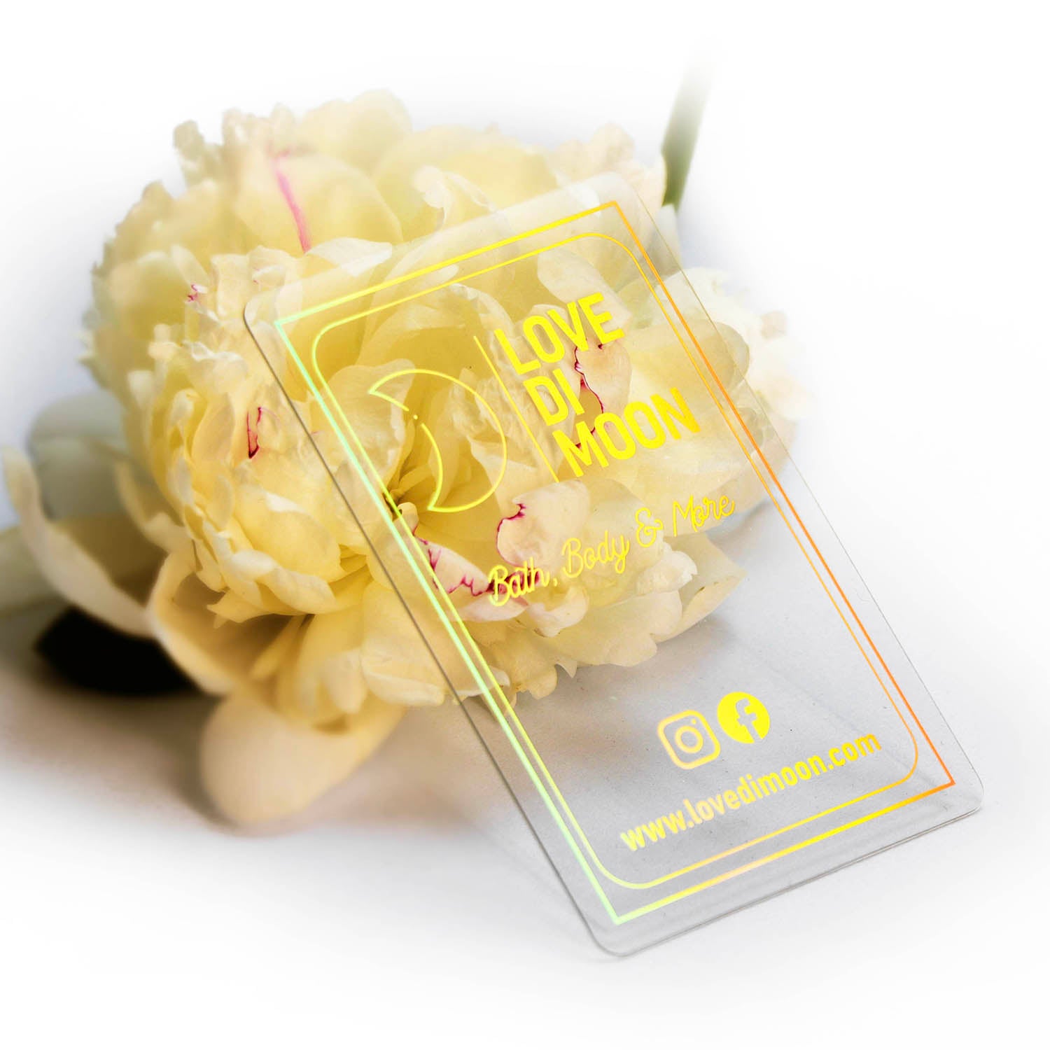 Add a flash of brilliance with transparent holographic business cards. Available in silver or holographic gold, these finishes bring futuristic flair without overwhelming the design. Whether you're branding a luxury product or just want your contact info to sparkle at an event, foil details are your best friend. Keep it strategic — a logo, a name, a highlight — and let the transparency do the rest.